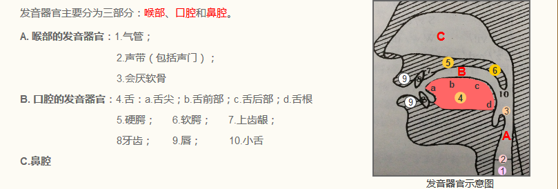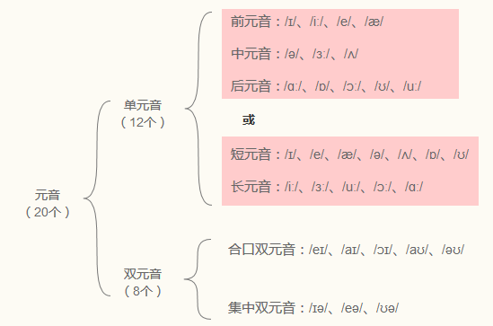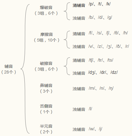 (一)音素:构成音节的最小单位。英语共有48个音素,分为元音音素和辅音音素,其中元音音素20个,辅音音素28个。元音音素可分为单元音和双元音,其中单元音又可分为前元音、中元音和后元音。辅音音素也按照不同体系进行分类。如,按照发音时是否振动声带分为清辅音和浊辅音;按发音的方法可分为爆破音、摩擦音、破擦音、鼻辅音、舌侧音和半元音。